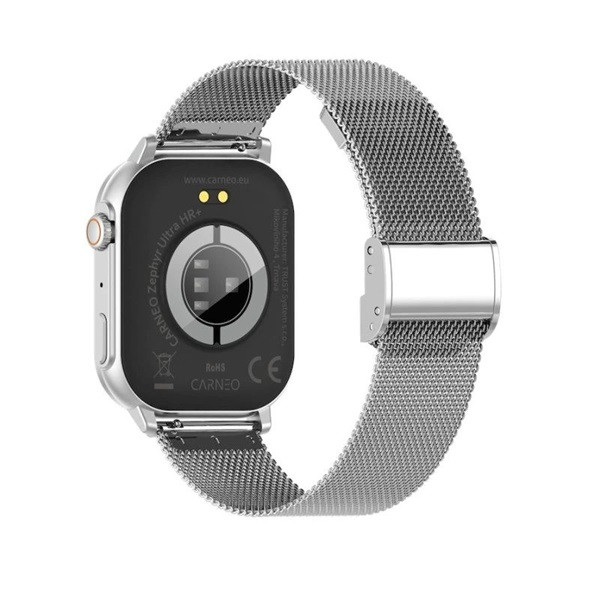 A modern, kültéri fitnesz okosóra Carneo Zephyr Ultra HR+ elegáns ezüst színben négyzet alakú SUPER AMOLED színes kijelzővel rendelkezik, amelyet edzett, ásványi üveg véd. Méri a pulzusszámot, a stresszt, a BMI-t, a megtett távolságot, nyomon követi az elégetett kalóriákat és az alvás minőségét. 280mAh-s akkumulátort tartalmaz, 5-7 napos üzemidővel. IP67 tanúsítvánnyal rendelkezik, így víz- és porálló. Kompatibilis az iOS és az Android rendszerrel. Az órához egy kellemes tapintású fehér színű szilikon szíj tartozik, amely sportos megjelenést kölcsönöz az órának. Az ízléses outdoor-luxus kialakítás könnyen kombinálható öltönnyel vagy szabadidőruhával. Az óra és az alkalmazás is teljesen magyar nyelvű, így biztosan jól kijöttök majd egymással.